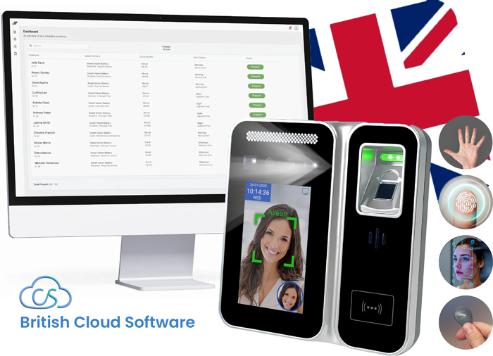 Our professional range of Biometric Face Recognition, Fingerprint, Palm Vein & Proximity Card clocking in machines reduce payroll time & cost by calculating hours worked, overtime, highlighting lateness, managing holidays & absence. See who's on site from any device or PC. Supports multi-branch operations all linking back in real-time to the central cloud-software.